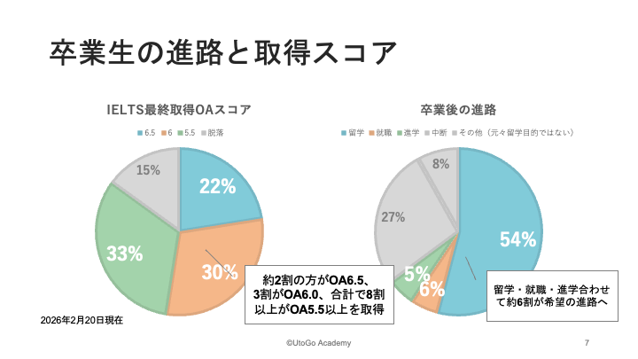 そんな方でも、UtoGo Academyに入塾してからは、生徒さんの約2割がOA6.5を取得しており、二人に一人がOA6.0以上を取得しています(2026年2月現在)。